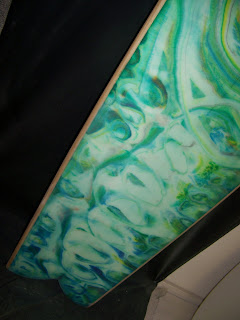 This is Matt's Bio resin recycled foam 9' longboard. This is his first longboard, usually rides shortboards. He wanted something light and pretty maneuverable. He was very eager to work with green materials. He really likes the board, even the smell of the bio resin. He did want any leash plug on the board. He rejoices with the great float and paddling. Also, states, the board is fast and is a section maker.